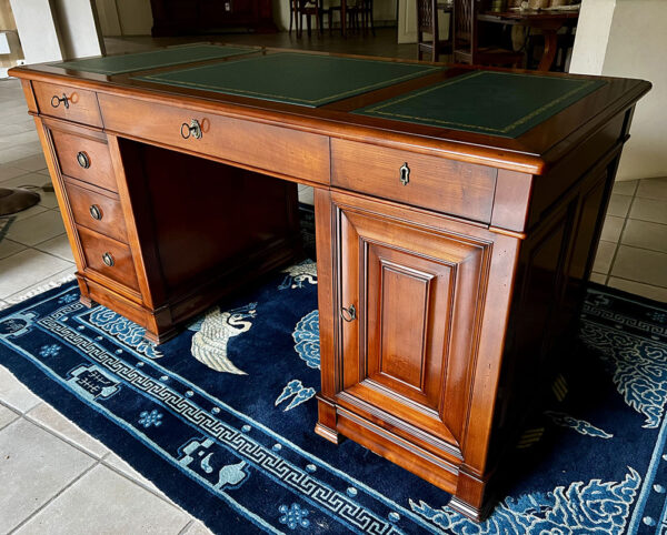 Scrittoio in massello di ciliegio prodotto dalla ditta Stella del mobile realizzato interamente da mastri artigiani Veneti e lucidato in gommalacca attraverso tecniche di un passato ancora attuale. Il piano è rivestito in pelle color verde con decori in foglia oro. Oggetto dal valore inestimabile e dalla caratteristiche uniche.