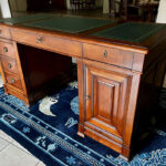 Tavolino espositore in noce con piano in vetro e basamento rivestito a specchio. Dimensioni cm 130 x 75, h 32 cm.